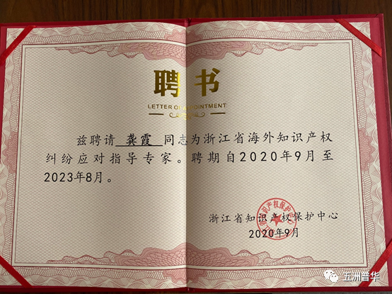 2020年8月26日,中国(浙江)知识产权保护中心公布了第一批浙江省海外知识产权纠纷应对指导专家名单。五洲普华副总经理龚霞经审核评选,入选该名单。